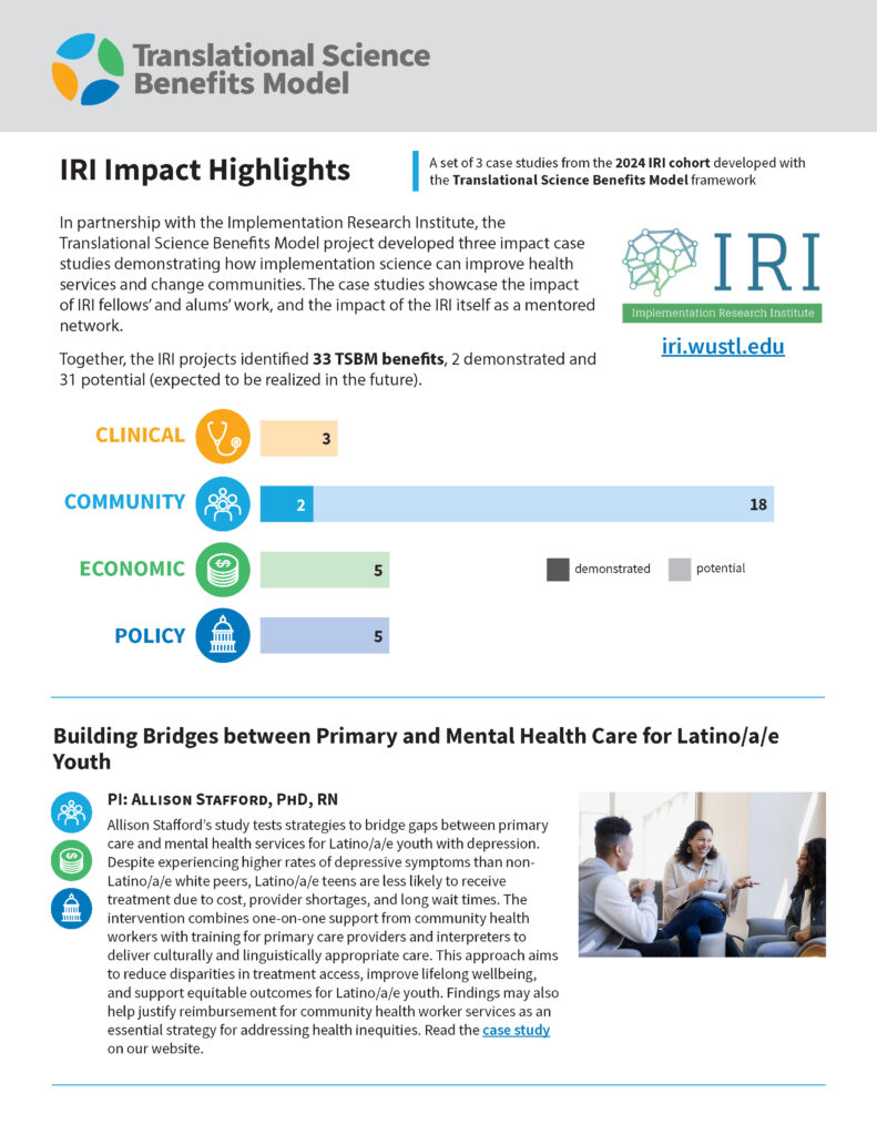 From Spring of 2024 through Spring of 2025, the Translational Science Benefits Model project team at the Center for Public Health Systems Science at the WashU School of Public Health worked with the Implementation Research Institute (IRI) to develop eight impact case studies demonstrating how implementation science can improve health services and change communities.